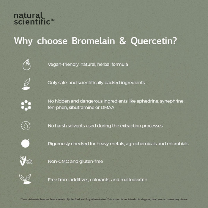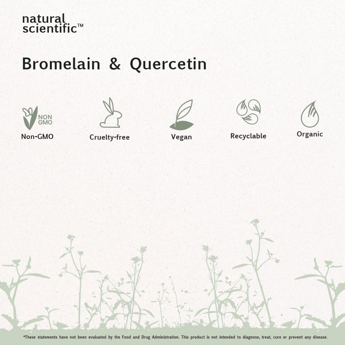 Strengthen your immune system and breathe easier with Natural Scientific Bromelain & Quercetin! This potent formula targets respiratory wellness, providing effective relief from allergies, sinusitis, and other respiratory issues. Derived from natural pineapple stems, bromelain is known for its powerful immune-boosting properties and antimicrobial effects, helping fight a broad range of pathogens. When combined with quercetin, a potent antioxidant celebrated for its antiviral and anti-inflammatory benefits, this supplement delivers comprehensive immune support. Experience the benefits of Natural Scientific Bromelain & Quercetin and feel the difference in your wellness today!