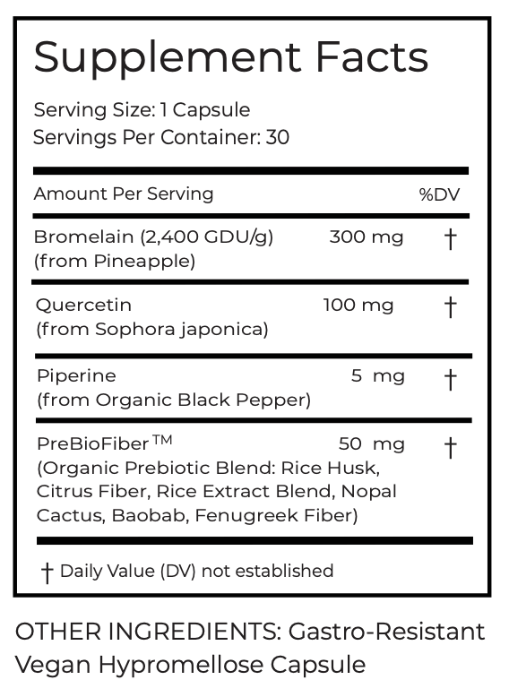 Bromelain and Quercetin work together to enhance immune function. Quercetin acts as a powerful antioxidant, helping to neutralize free radicals, while Bromelain supports the body’s natural inflammatory response. Together, they boost the immune system by reducing inflammation and oxidative stress, strengthening your body’s defense against infections.*