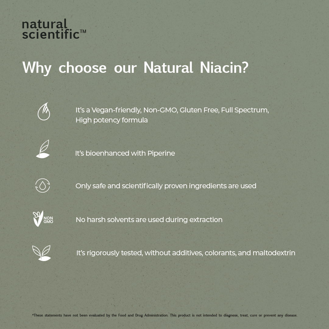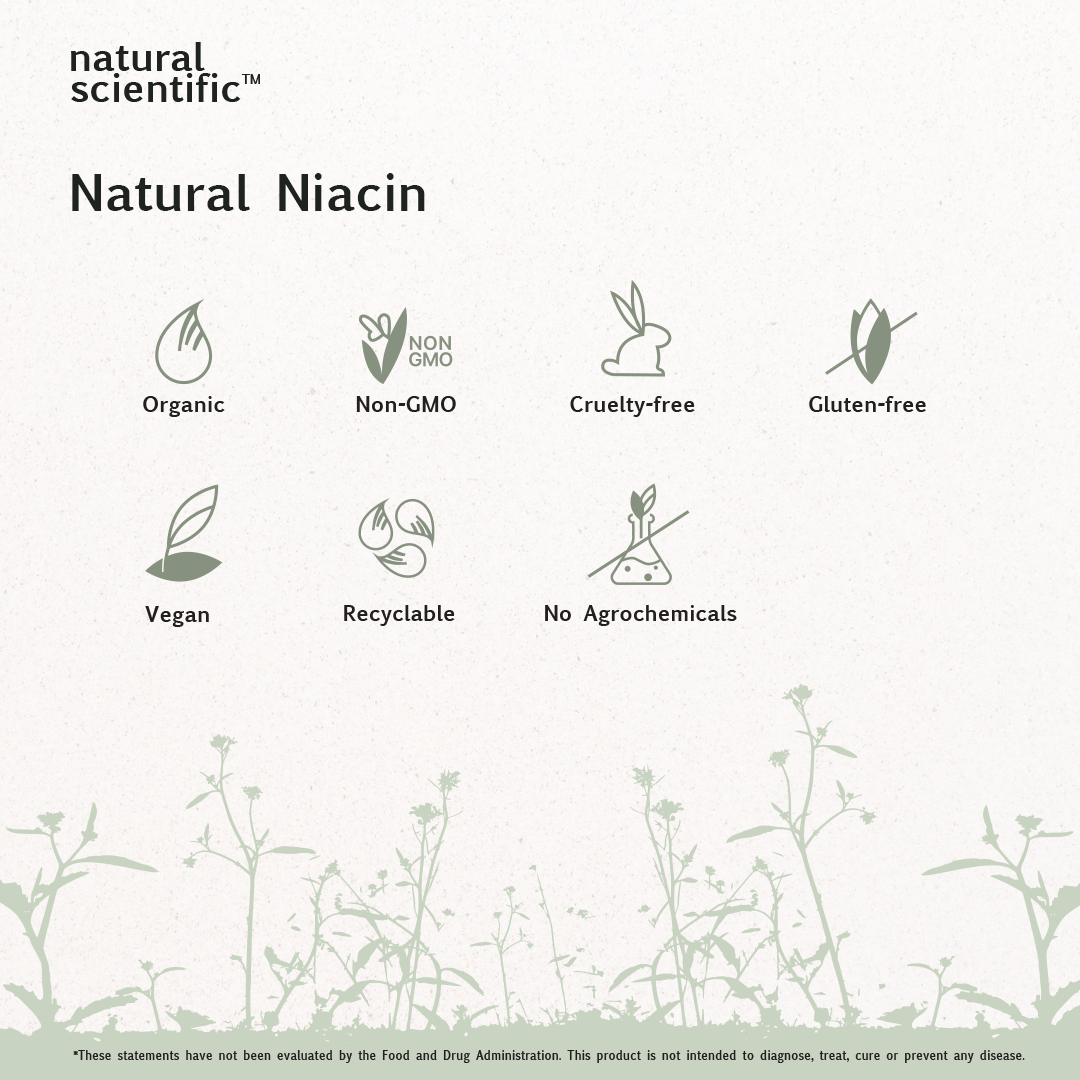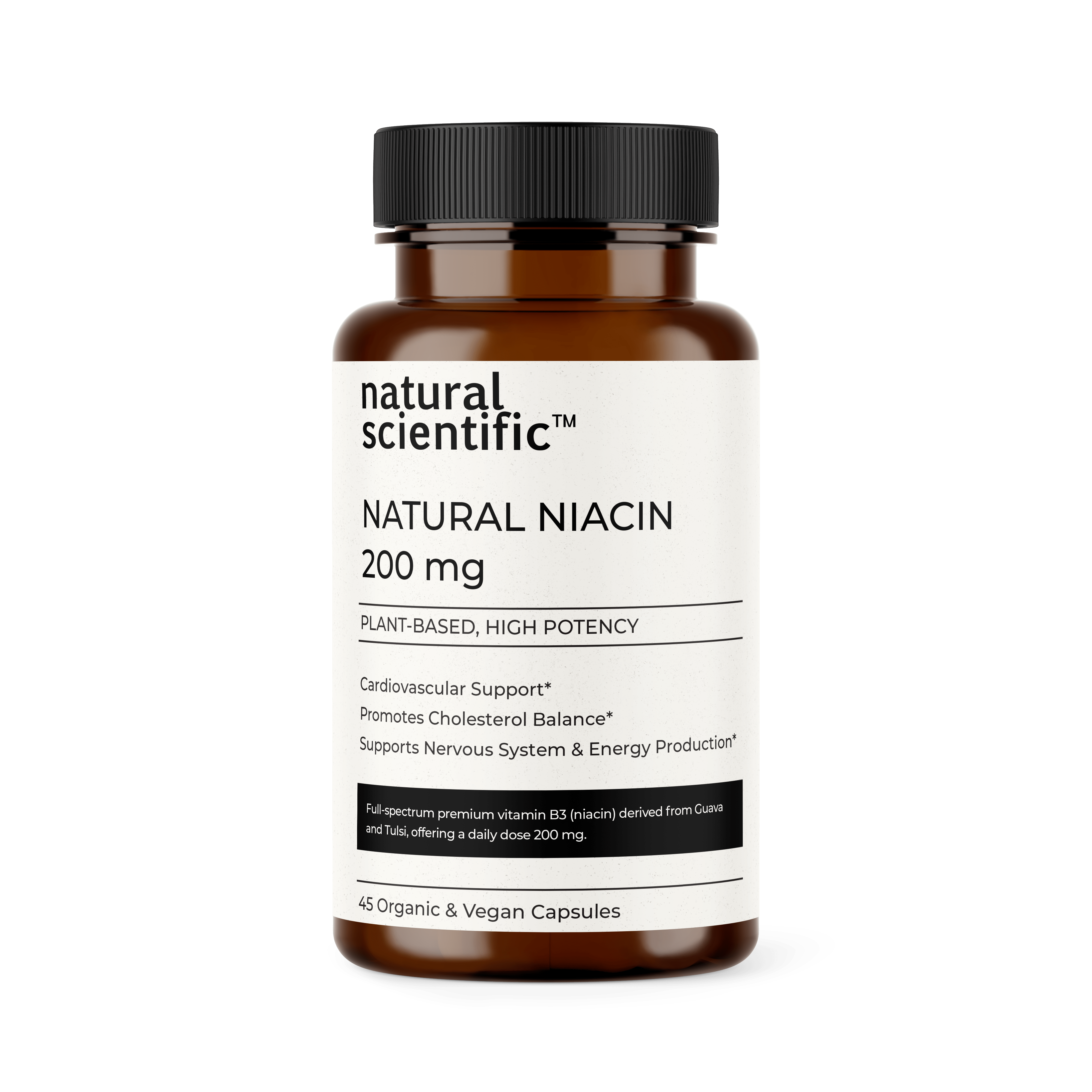 Natural Scientific Natural Niacin (Vitamin B3) is a plant-based, organic niacin supplement derived from Guava and Tulsi, providing a highly potent daily dose of 200 mg of niacin.*