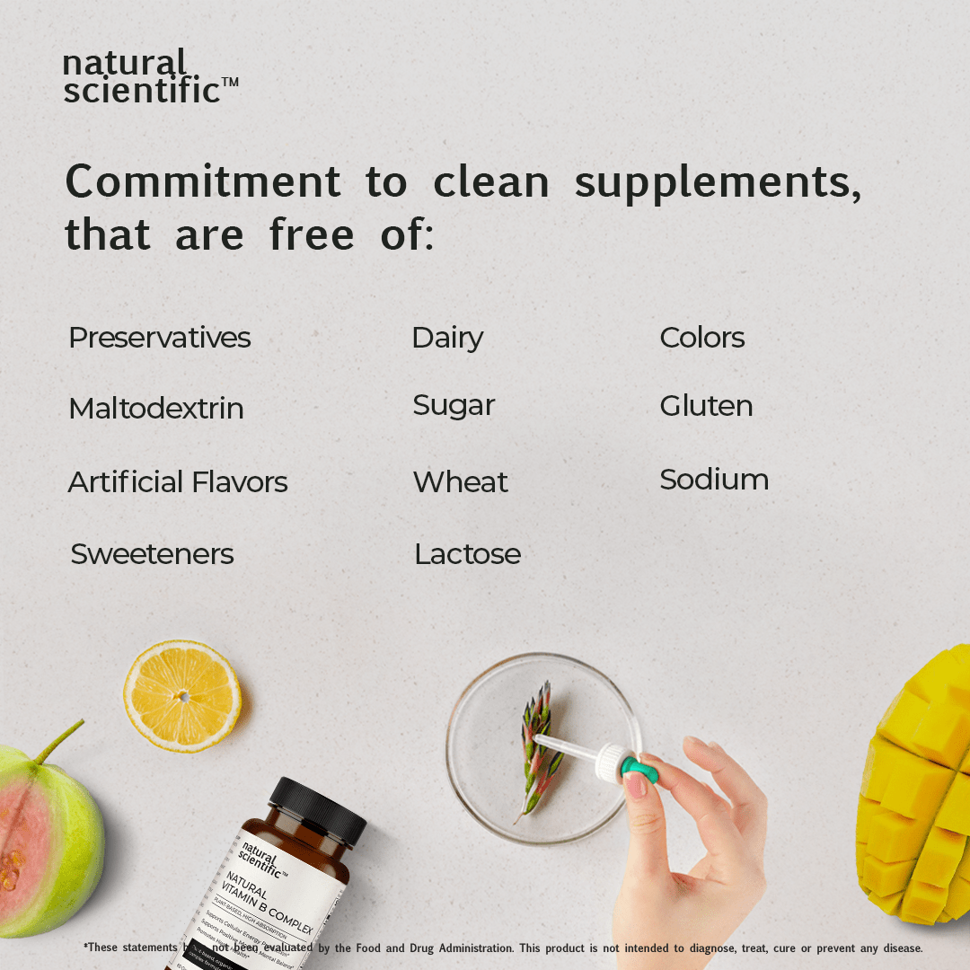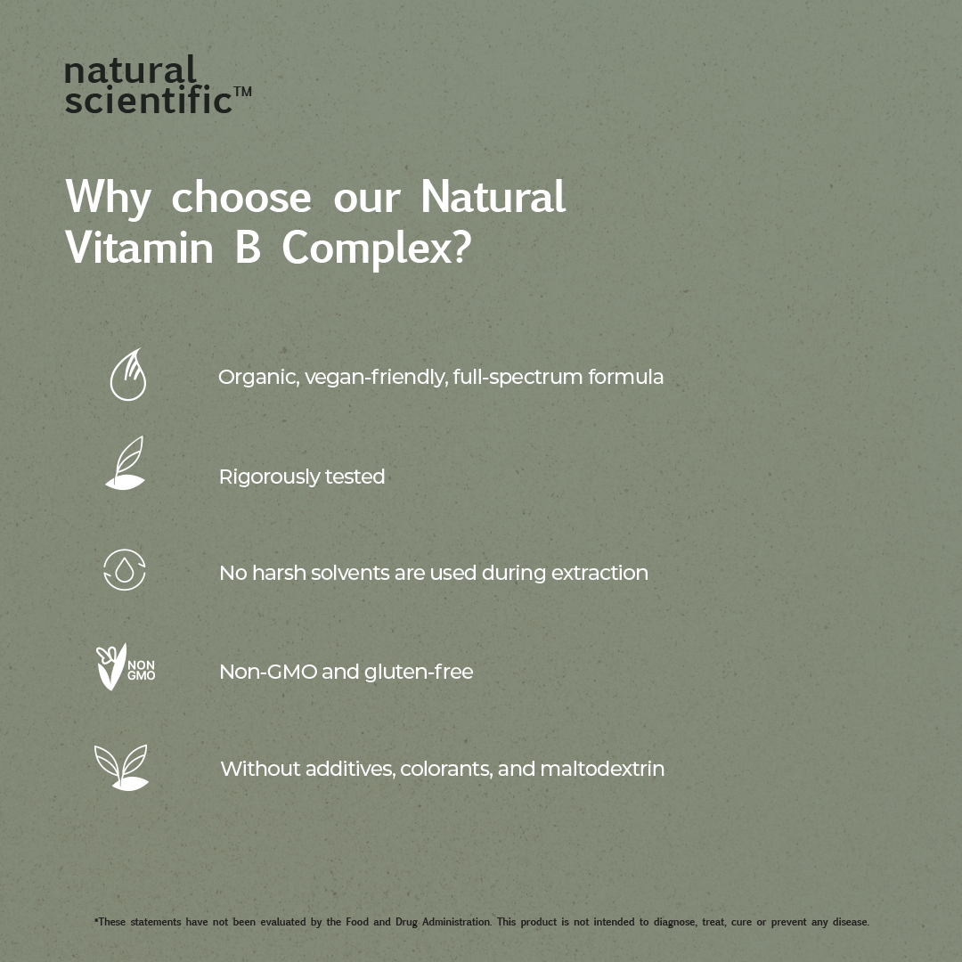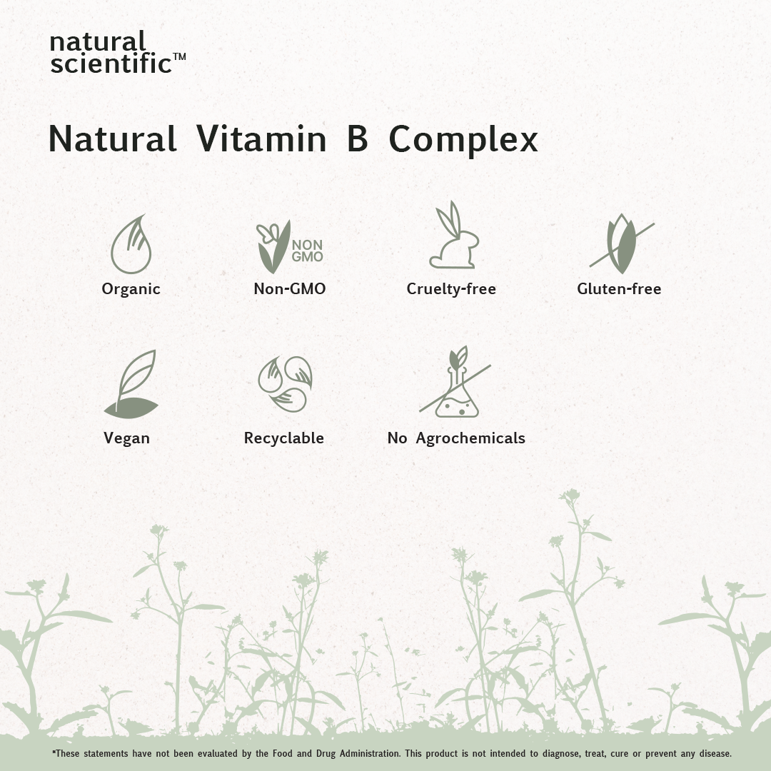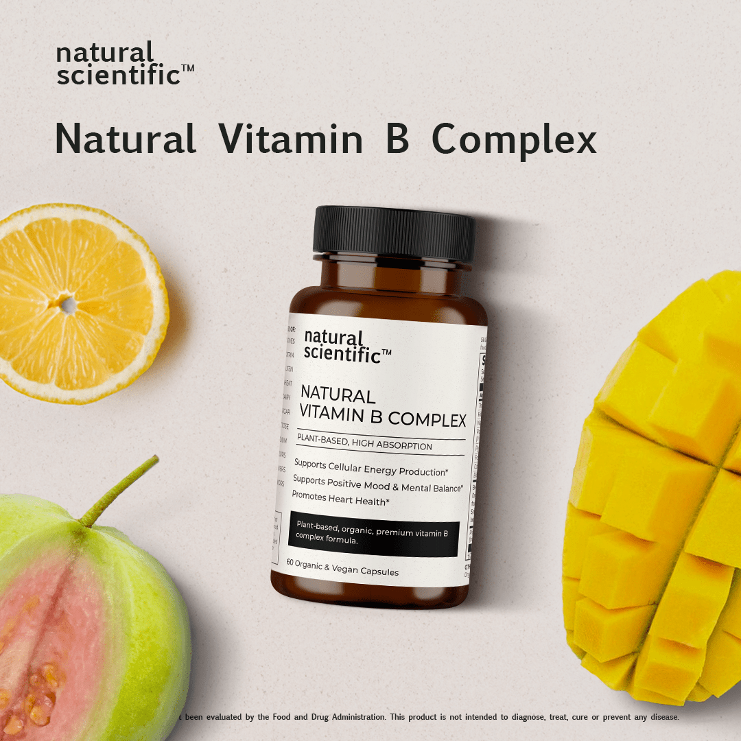 Discover the power of nature with Natural Scientific Natural Vitamin B Complex, a plant-based, organic blend of essential B vitamins derived from organic Guava Fruit, Spirulina algal cells, Chlorella algal whole cells, Mango, Sprouted Mung Beans, Saccharomyces Cerevisiae yeast cells, Lemon Peel and Holy Basil Leaf. Our Natural Vitamin B Complex supplement stands out for its commitment to enhanced bioavailability and easy absorption, setting it apart from synthetic Vitamin B Complex alternatives.*