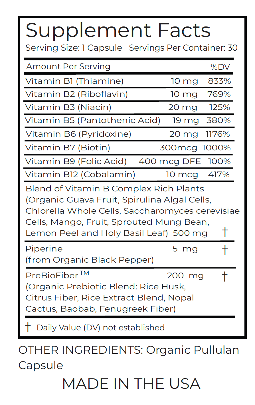 Our Natural Vitamin B Complex supplement stands out for its commitment to enhanced bioavailability and easy absorption, setting it apart from synthetic Vitamin B Complex alternatives. Embracing a holistic approach, this product caters to individuals seeking supplements with minimal additives or allergens. The inclusion of organic plant extracts enriches our Vitamin B Complex with additional beneficial phytonutrients, antioxidants, vitamins, and trace minerals. This contributes to a comprehensive, natural, and well-rounded nutritional profile.*