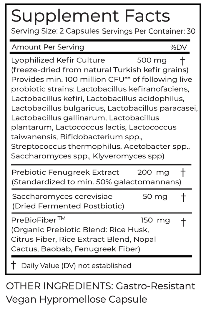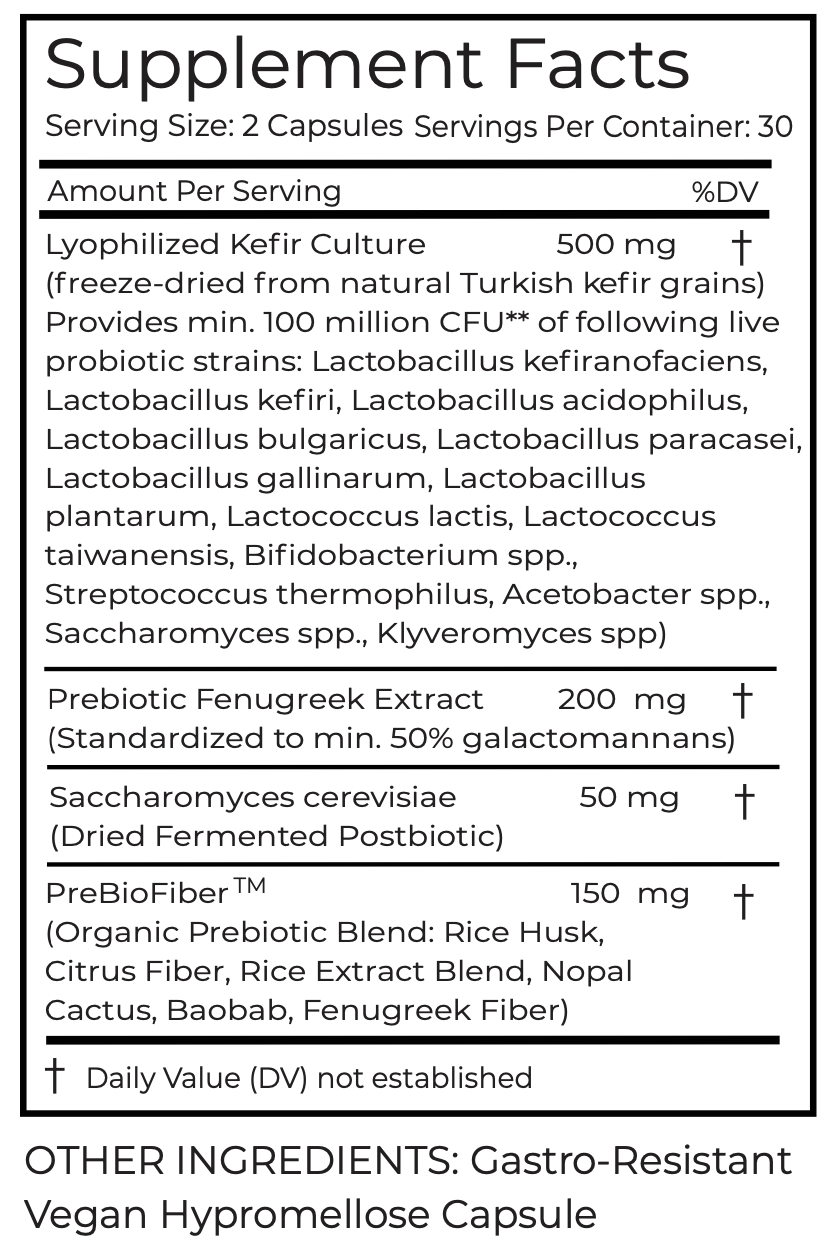 The combination of kefir grains, fenugreek extract, and Saccharomyces cerevisiae works synergistically to enhance gut health and digestion. Kefir culture provides beneficial probiotics, while fenugreek acts as a prebiotic, feeding good bacteria. Saccharomyces cerevisiae, as a postbiotic, helps balance gut flora, improving digestion, nutrient absorption, and overall gastrointestinal health.*